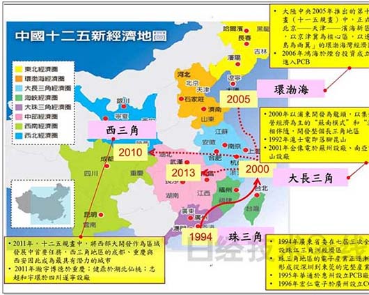 跟隨著中國(guó)大陸開發(fā)腳步與政策推動(dòng),PCB產(chǎn)業(yè)依循同樣腳步進(jìn)行布局,包括1994年的珠三角開發(fā)區(qū)、2000年長(zhǎng)三角開發(fā)區(qū)、2005年環(huán)渤海開發(fā)區(qū)以及2010年中央開始推動(dòng)大西部開發(fā)的西三角開發(fā)區(qū);而臺(tái)從1994年華通于惠州設(shè)立PCB廠開始,臺(tái)灣PCB廠商于中國(guó)大陸也跟循大開發(fā)政策進(jìn)行布局,目前主要集中在華南、華東,而從2010年開始也有臺(tái)商開始進(jìn)駐重慶、成都等西部城市。